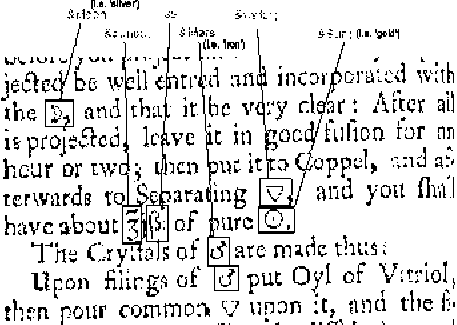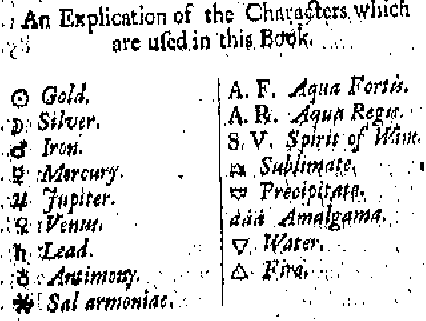 Figure 2 shows how alchemists used these symbols in their manuscripts. Figure 2 can be roughly translated as "�be well entered and incorporated with the silver, and that it be very clear: After all is projected, leave it in good fusion for an hour or two; then put it to Coppel [unknown], and afterward to separating water, and you shall have about ounces of pure gold. The Crystals of iron are made thus: Upon filings of iron put sulfuric acid, then pour common water upon it�" The very notion of representing metals with symbols or abbreviations originated with alchemy and continues in modern chemistry with letters representing chemical elements. Alchemy, however, had few standardized notations and its symbols were open to interpretation. Even alchemical apparati had numerous symbols in alchemical literature.